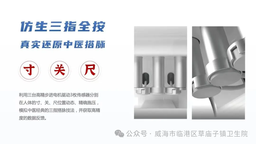 大经中医智能脉诊仪的最大特点在于独特的仿生三指全按搭脉技术,利用三台高精步进电机驱动3枚传感器分别在人体的寸、关、尺位置动态、精确施压,模拟中医经典的三指搭脉技法,并获取高精度的数据反馈。