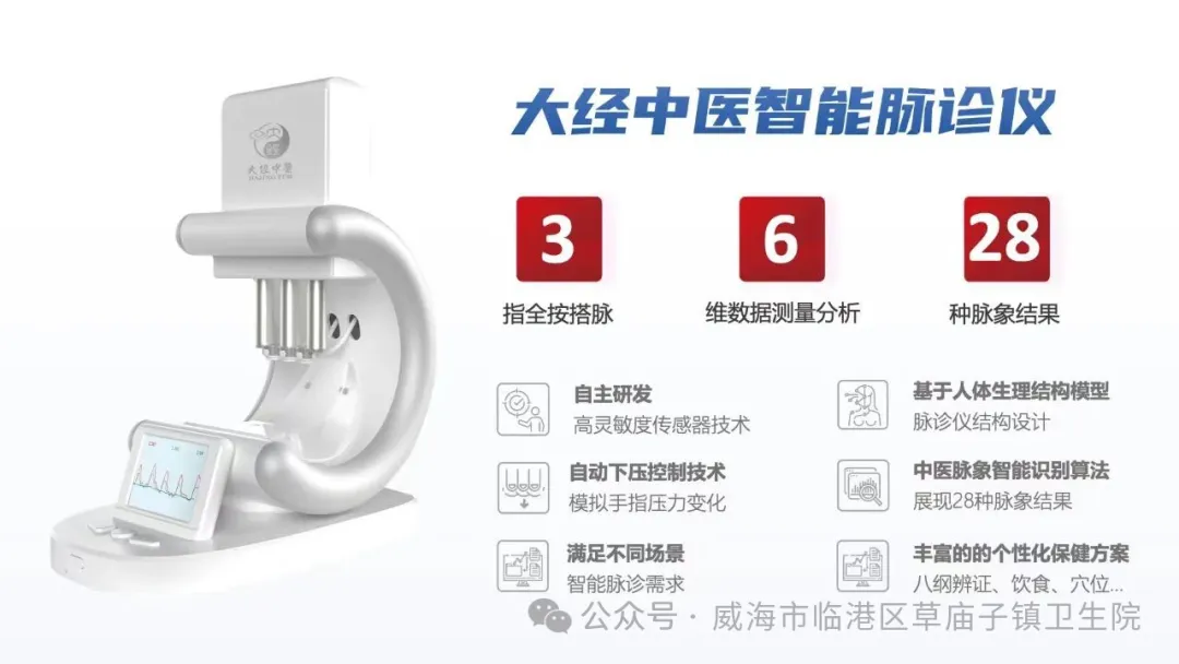 为充分利用新质生产力帮助中医实现从传统到现代的华丽转身,草庙子镇卫生院配备了大经中医智能脉诊仪。用脉诊仪为签约群众免费把脉,体验现代大数据和人工智能技术与传统中医相结合的成果,通过“数智中医一体化诊疗系统”,充分发挥中医“望闻问切、四诊合参”的诊疗特色,让老百姓在家门口就能享受到技术水平更高、质量更好、效率更高、更可持续的优质中医临床服务。